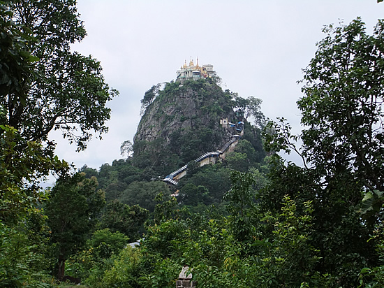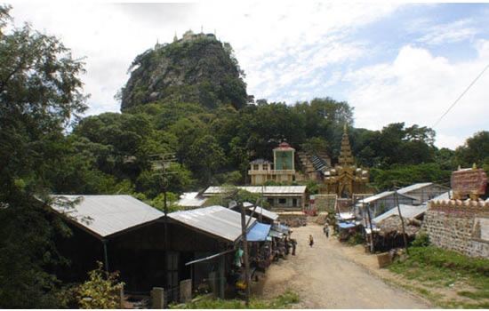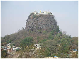 壮大な仏教遺跡群、バガンの中にあり、土着信仰であるナッ神の聖地です。 標高約1,500mの山の頂上にその聖地はあります。見ての通り面白い形をした山です。この形となったのは、大昔、山の大噴火で山頂から吹き飛ばされた山頂部分が飛んで、現在の位置に突き刺ささり、今の形となったという説が有力な説とされています。