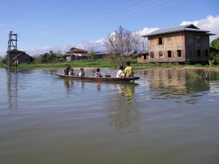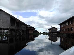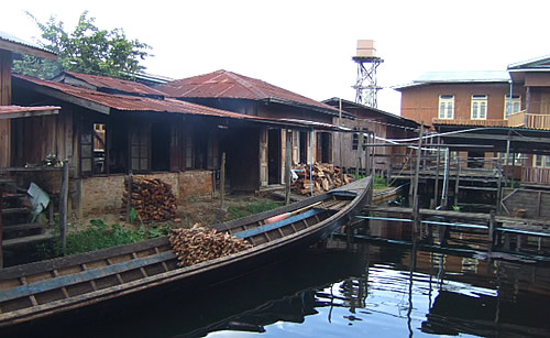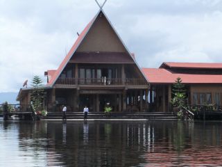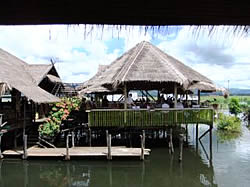 海抜1300mのインレー湖ボート乗り場に到着。そこから細いボートに乗り換えて湖上を1時間走ると、インレー湖の水上に「ゴールデンアイランドコテージ」に着きます。